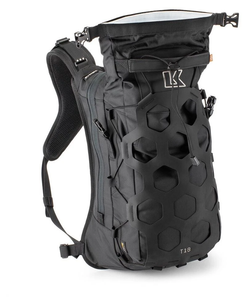 De Trail 18 is gevormd uit drie verschillende secties. Een met de rits te openen compartiment a la 7 liter, perfect voor bijvoorbeeld de Kriega tool-roll gecombineerd met een hydratatiepack. In dit compartiment vind je ook een volledig waterdichte zak voor bijvoorbeeld telefoon en portemonnee. De bulk van de bergruimte bevind zich in het waterdichte roll-top gedeelte welke tot 12 liter te vullen is. Dit ontwerp maakt het een zeer compacte rugzak wanneer niet alle ruimte in gebruik is. Eén van de nieuwe toevoegingen aan de Trail rugzakken is het Hypalon net aan de achterzijde van de rugzak. Hier geeft Kriega je bijvoorbeeld de mogelijkheid natte kledij op te slaan of om gewoonweg meer mee te kunnen nemen.